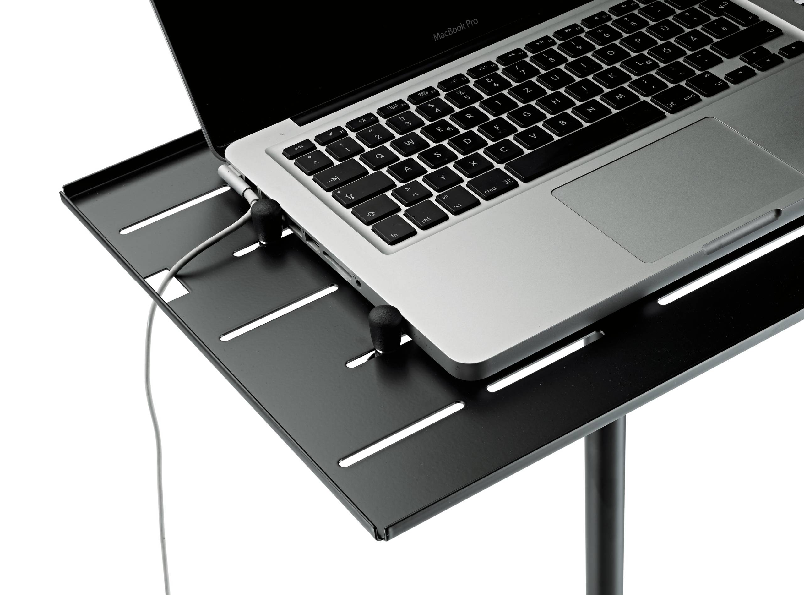 The laptop stand offers stability and safety. The generously sized tray provides space for all common laptops. Thanks to the adjustable clamping bolts with rubber caps, the laptop is protected and can be secured safely on the stand. To secure the laptop, the clamping bolts are pressed on the laptop using wing nuts. An additional hole allows convenient cable management. The height of the stand can be adjusted variably. For transport the tray can be removed easily without the use of tools. The robust tripod legs quickly collapse together into a compact and easy to carry package.