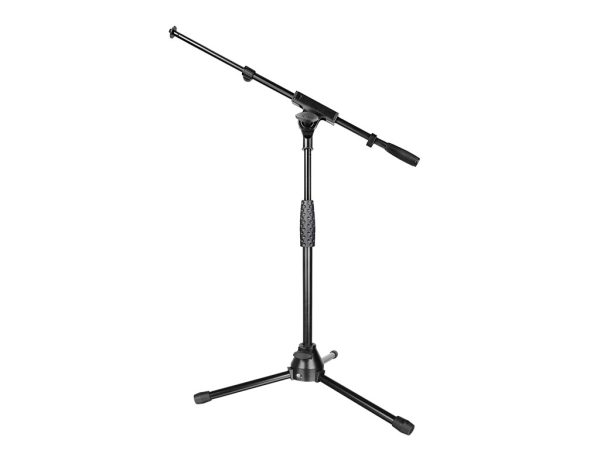 Microphone stand with low profile giraffe. Suitable for musical instruments such as drums. Fastenings made of metal. Deployable between 0.5 and 0.7 m. Extendable giraffe between 48 and 87 cm.