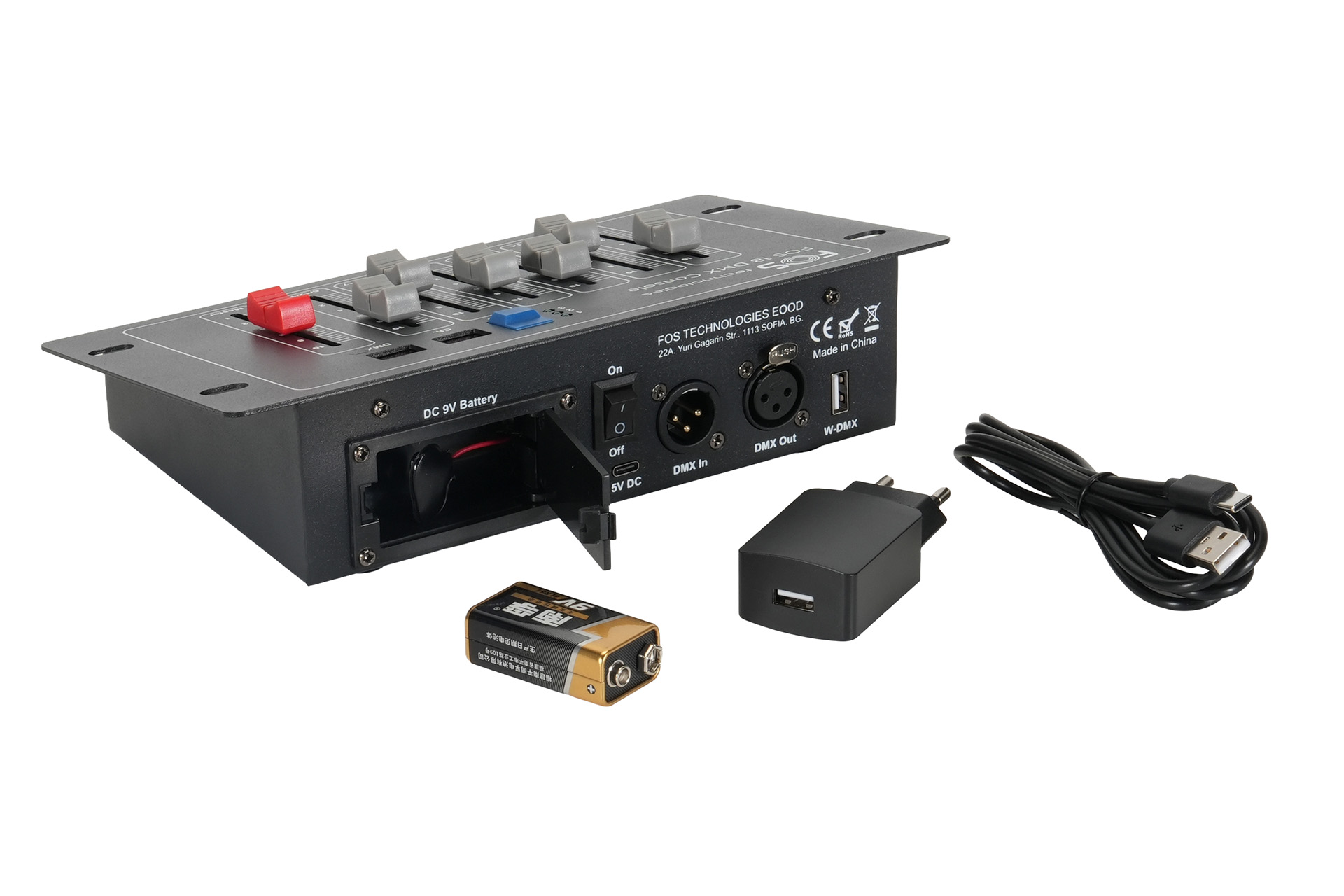 Portable DMX Controller featuring 18 DMX channels across 3 pages, equipped with 6 faders and a master dimmer. Includes a display for selected channel and DMX value. Designed for compactness and ease of use, it offers a 3-pin XLR Female signal output. Powered via a 5V DC USB Type-C connection, with an optional 9V battery operation. Dimensions: 240 x 140 x 65 mm. Weight: 1.1 kg.