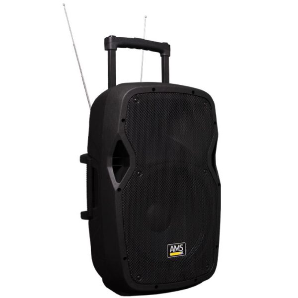 Self-powered loudspeakerA 121 TB MKII is a 120 W program amplified loudspeaker, composed of a 10 “woofer and a 1” compression driver, with a trolley transport system. Incorporates insertion cup for 35 mm support. It has a USB/SD interface for playing MP3 files as well as Bluetooth connectivity for playing audio files from mobile devices. It also has additional microphone inputs with built-in echo and LINE level input. It includes a wireless handheld microphone and a headset microphone, on the VHF band. It can be used with an internal rechargeable 12Vdc battery, with an auxiliary 12Vdc socket or with an AC power supply. It also has a remote control to control the system.