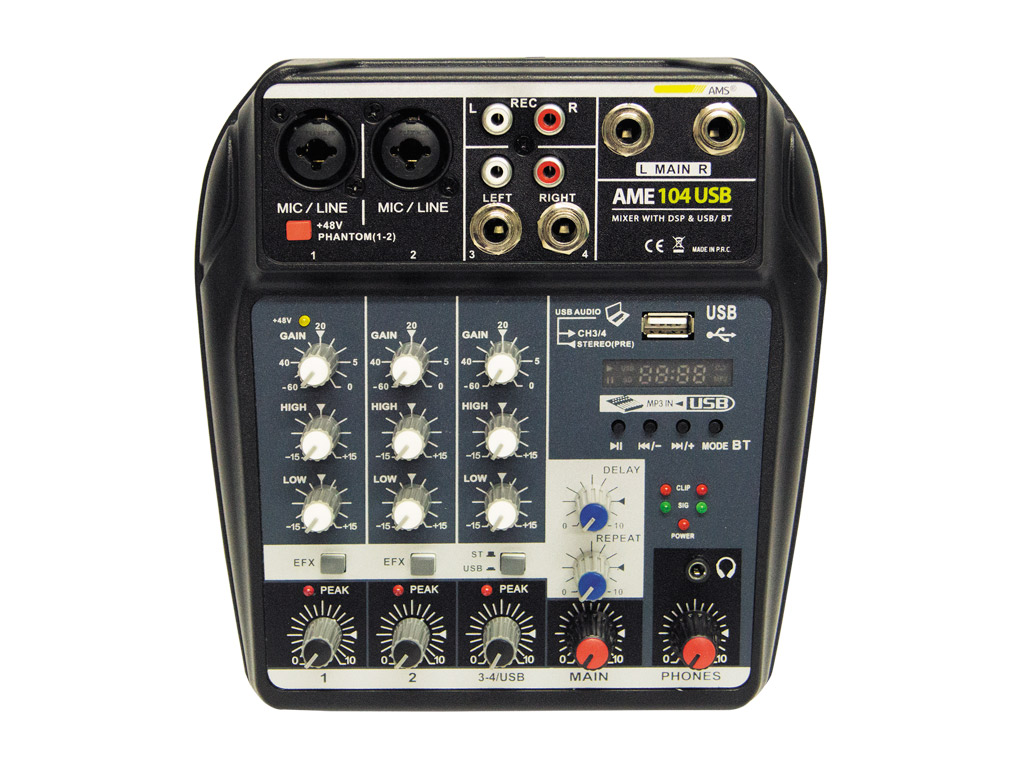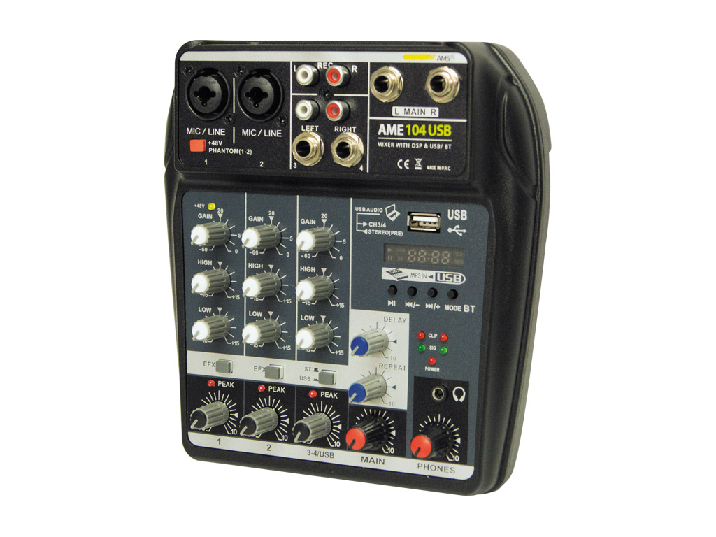 AME 104 USB Analog audio mixer.AME 104 USB is a compact mixer that incorporates 2 MIC / LINE inputs (with phantom power) + 1 stereo input. In addition, it includes USB interface and Bluetooth . Another interesting functionality is its behavior as a sound card, allowing mixing analog inputs with audio tracks from a PC.All inputs have 2 tone controls and general reverb effect, as well as connectivity for externalrecording and headphones output.Its wide variety of functions make it suitable for a multitude of applications: events, stages, party halls, mobile DJ, etc