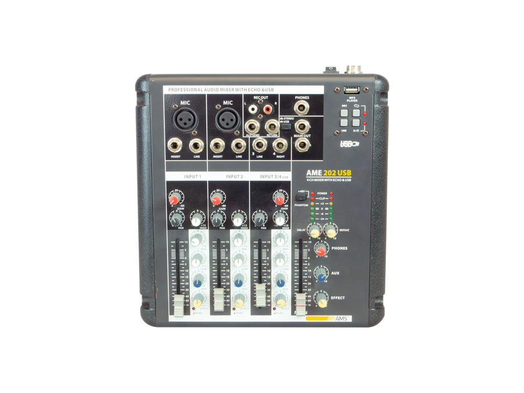 They are distinguished by the number of mono input channels (2 on the AME 202 USB model) or (4 on the AME 402 USB model). Both models also incorporate 2 stereo channels.
