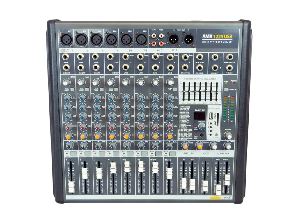 The AMX series consists of two mixers with 4 and 8 mono MIC/LINE channels and 4 additional stereo channels. Each mono channel incorporates a +48V phantom-powered preamp for condenser microphones and a 100 Hz low cut filter.