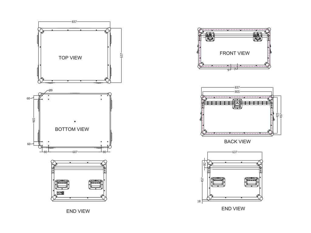 CW 864 is a flightcase made of wood with aluminium sections and an interior lined with protective foam. It has hinged lids, safety latches and 2 handles on each side. In addition, the lower part is prepared for the easy installation of 4 wheels (not included). Its external dimensions are 837 x 457 x 637 mm and its internal dimensions are 805 x 605 x 425 mm, and its weight is 25 Kg.
