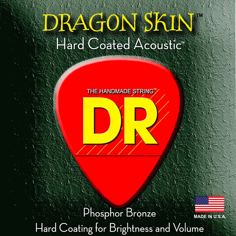 DRAGON SKIN™ Acoustic Guitar Strings feature DR’s clear coating on a phosphor bronze wrap wire to prevent dirt and perspiration from reaching the hexagonal core wire, preventing corrosion. The coating, which is applied to all strings in the set, is ultra-hard and doesn’t dampen vibration like softer coatings do. The strings have more projection, fewer unwanted overtones, greater clarity and articulation than uncoated strings.
