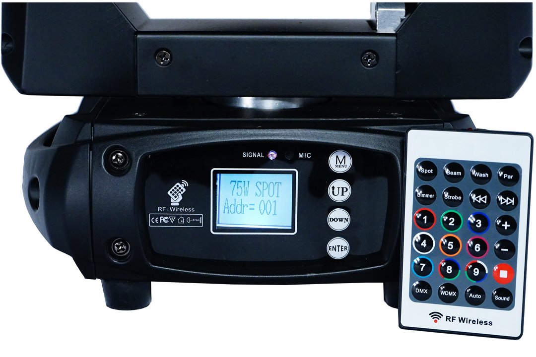 Led 75watt Spot Moving head, 8 colors , Rotating gobo wheel with 6 gobos plus open,2.5M-15M electric focus, 3 facet prism with variable speed and direction , powercon in/out ,11/13 Dmx channels. ·Light Source / Optics Based on 75 Watts white light source50,000 hours rated lifespan510 lux @ 15 meters, 11231 @ 2,5 metersBeam angle: 14°Anti-reflection 136 mm front lenses ·Effects 8 dichroic colors plus open6 rotating gobos plus open3-facet rotating prismLinear dimming & strobe effects ·Control Auto, Sound & DMX512 control modes11 & 13 DMX control channesIR control for basic functions included in the package (Dimming, Strobe, Auto & Sound mode activations with adjustable speed / mic sensitivity)1,44′ TFT LCD display for accessing the menu options ·