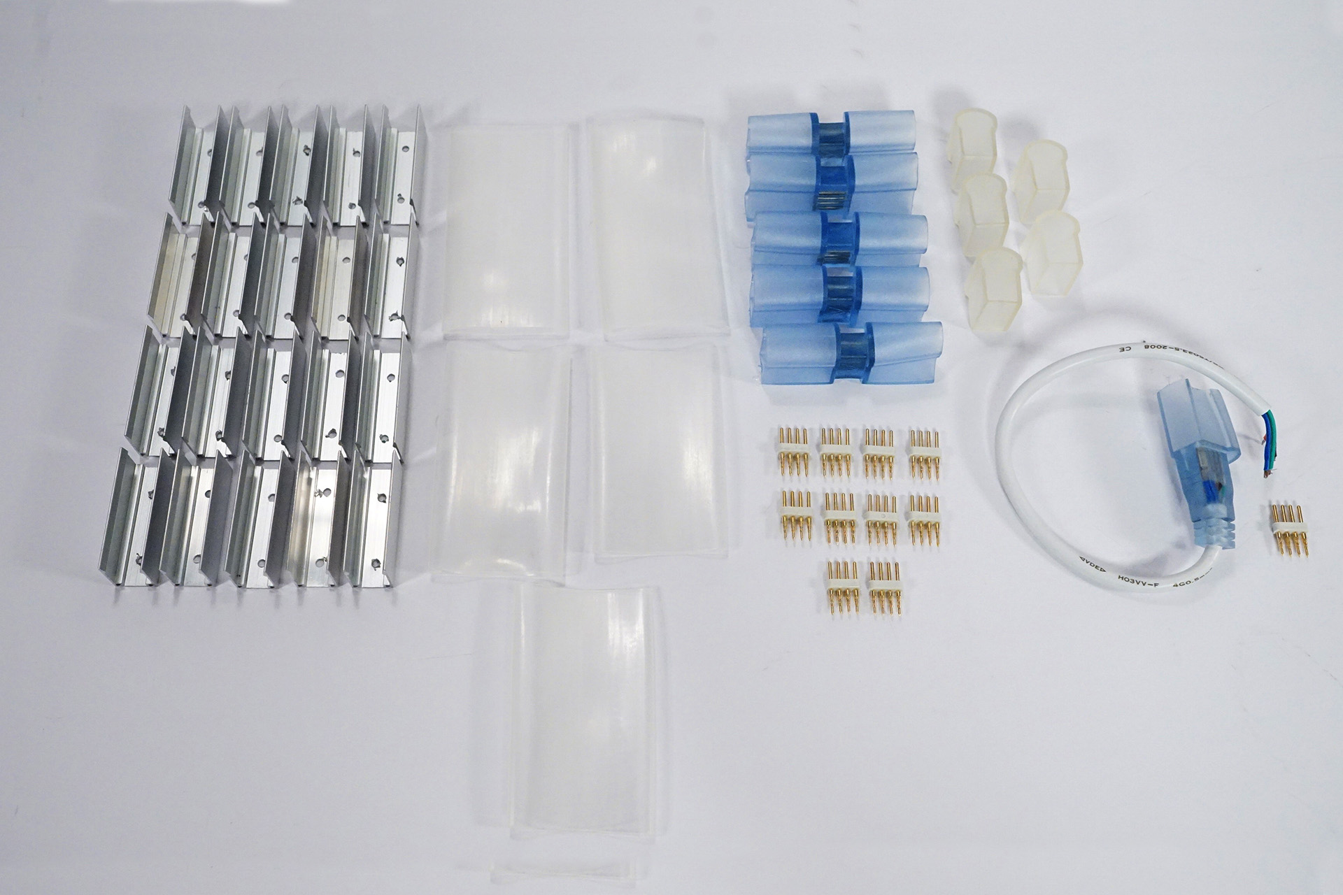 Weatherproof IP67 Neon Flex 10 meter SMD5050 Led RGB tape set, Power input: DC 24V, Power/meter: 17.2W, Cutting length: 0.5m, Max. length/power input: 15m, size 20mm x 10mm, included powercord , 10 mounting clips, 5 end caps, 5 middle connectors, 5 shrink tubes.