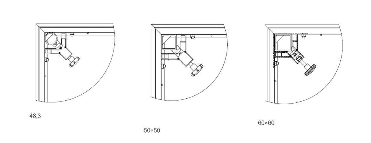 Main systems on the market provide legs 48,3 round, 50×50 square, 60×60 square. Usually to fit the leg corner you need to exchange to the pressure cube inside the corner.