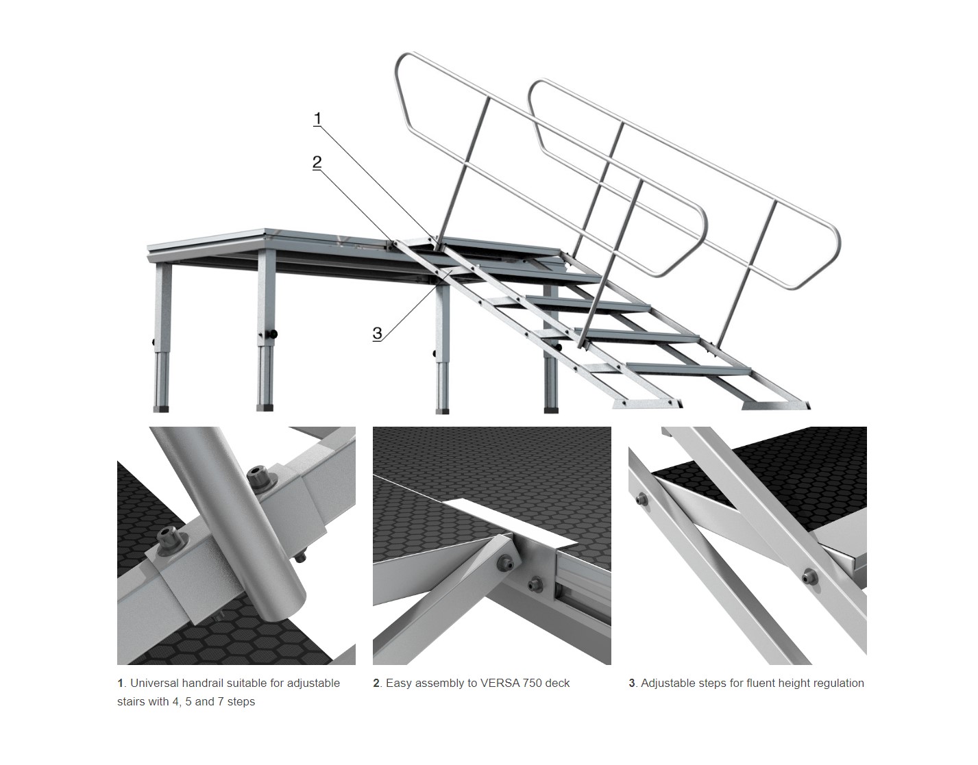 Universal handrail suitable for adjustable stairs with 4, 5 and 7 steps.