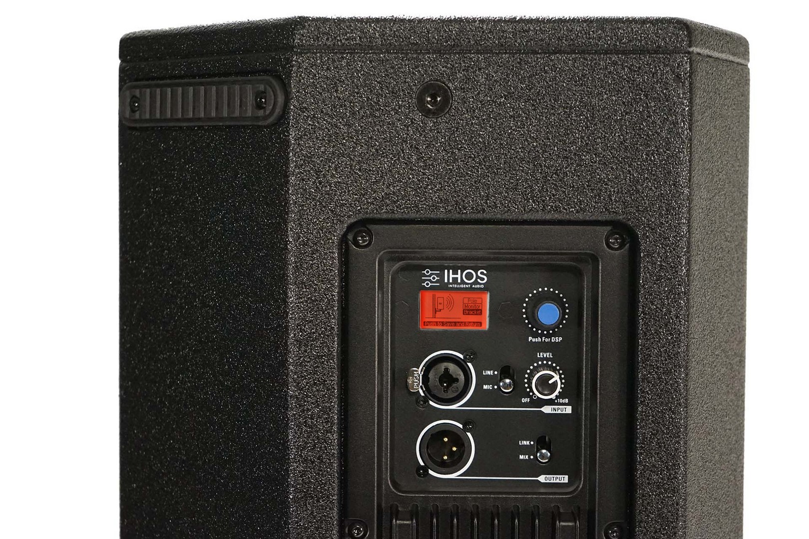 Professional plywood active speaker 10 inch with LCD screen and multiple DSP, German Engineering class D amplifier, 350W (LF) + 350W (HF), 700w RMS, 1.35 HF drive, 10“ woofer 2“VC, flypoints, top handle and stage monitor feature.