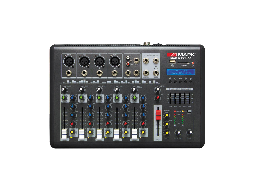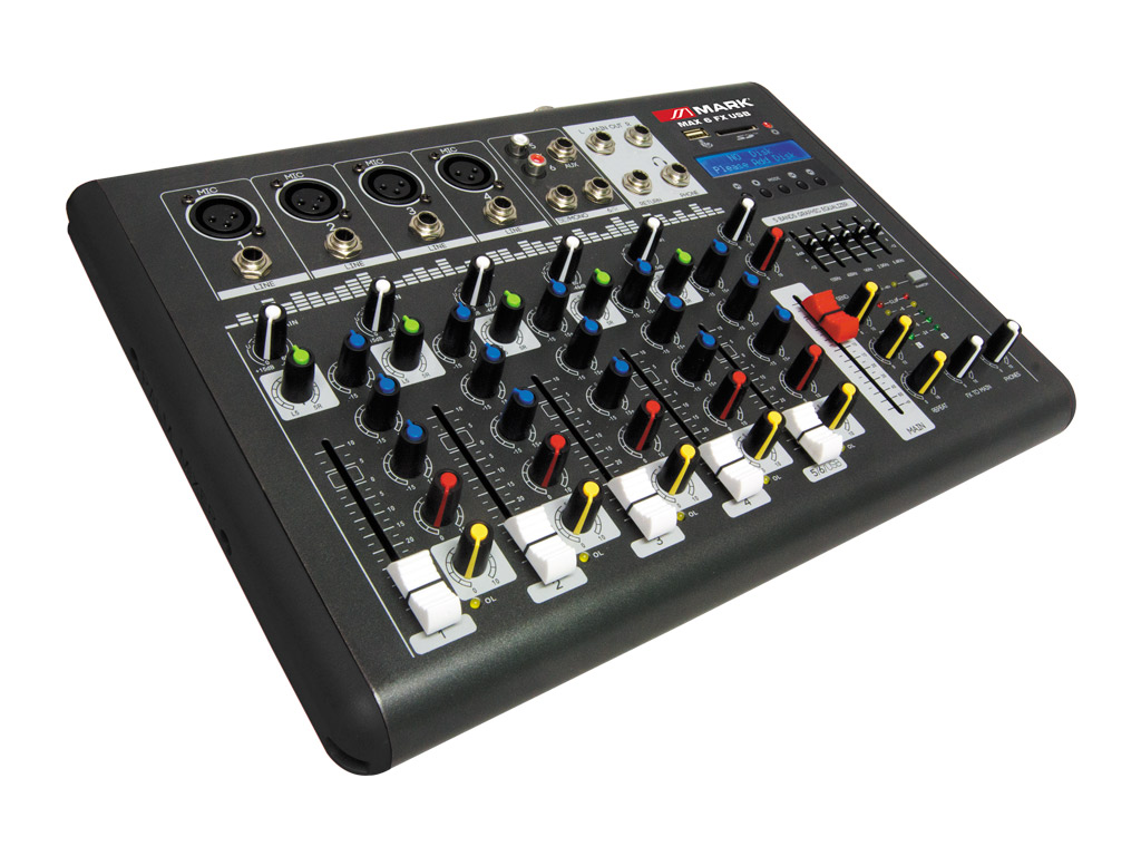 Audio mixer with 4 mono MIC/LINE channels and 1 stereo channel. Its MIC/LINE input channels incorporate phantom power for condenser microphones.
