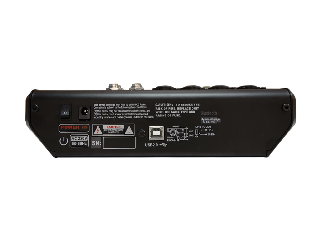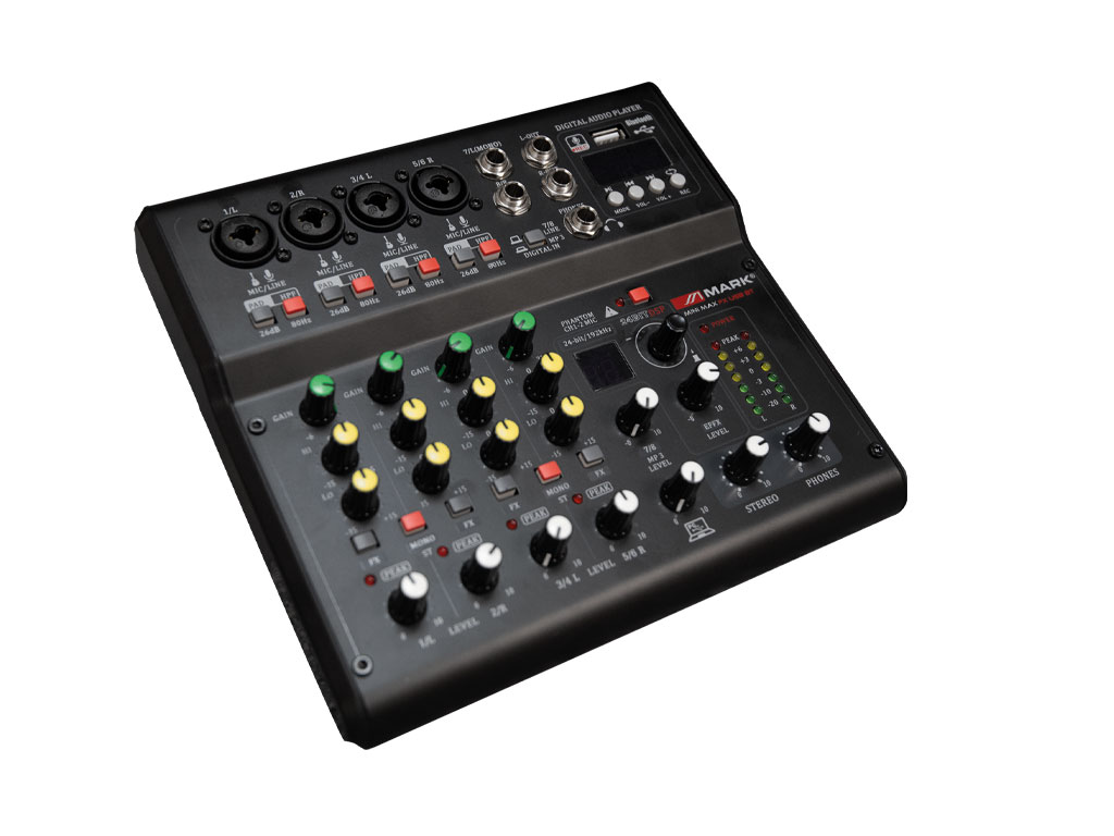 Audio mixer with 4 mono MIC/LINE channel sand 1 stereo channel. Its MIC/LINE input channels incorporate phantom power for condenser microphones.