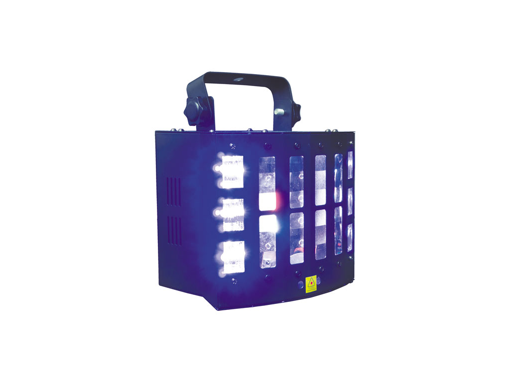 MULTILIGHT300 MULTILIGHT 300 is a complete lighting projector which includes several effects combining LEDs light and LASER. It includes 9 LEDs x3W each, Red+Green+Blue+White+Amber+Pink+Yellow+Orange+Violet, able to create amazing effects thanks to the multifaceted frontal lenses. It also integrates 6x 3W UV+Strobe LEDs (2 in 1) in two rows to complete the obtained effect. Finally, MULTILIGHT 300 incorporates 2 LASER diodes (red and green) with several patterns.All these effects are combined with movement thanks to its step-by-step motors, through DMX (with 9 channels), Auto and Audio programs.The configuration interface has a display with all the information and buttons to navigate through menus, selecting parameters such as automatic programs, prefixed colours and audio level.MULTILIGHT 300 includes remote controller in order to select programs and operating modes.