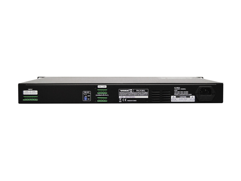 PA 2120 L is an installation amplifier with 2 channels of 120W each, class D.