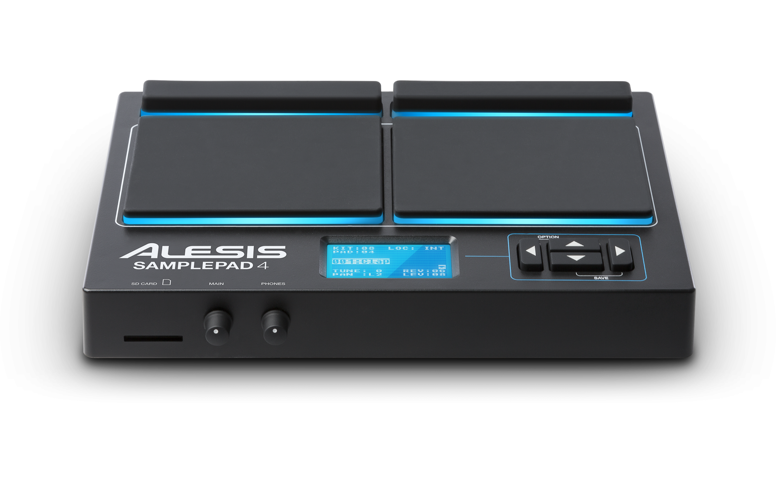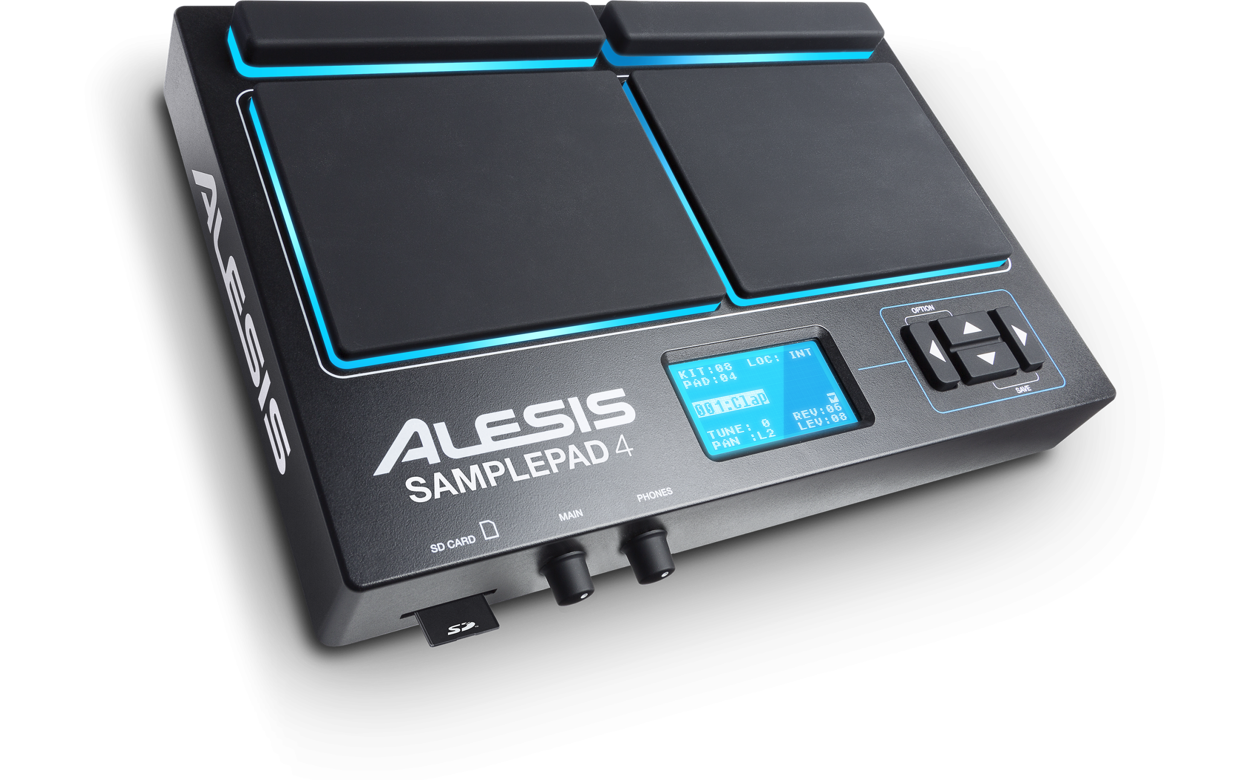 The Alesis SamplePad 4 is an all-in-one percussion and sample-playing instrument. It comes equipped with four responsive, LED-illuminated rubber pads, dual zone trigger input, and ten preset kits. With a built-in library of the most commonly requested percussion and electronic drum sounds and the ability to load samples, the only limit is your imagination. For even more flexibility, you can tune and add reverb to your sounds. Intuitive navigation makes it easy to browse through your kits and you can drag and drop your samples via USB on a Mac or PC without removing your SD card. The bright blue LED lighting is clearly visible in every setting.