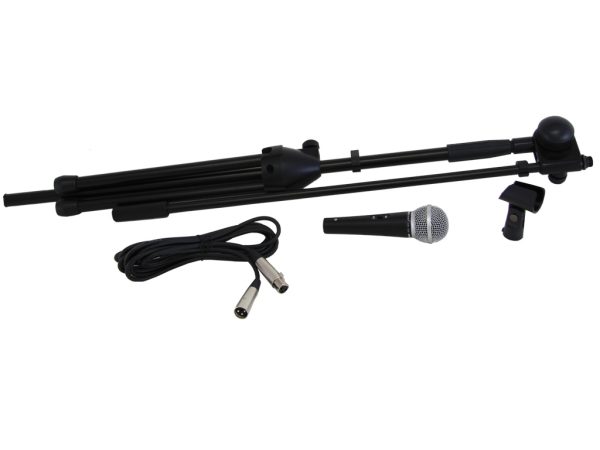 Microphone set composed of:Unidirectional dynamic microphone with ON/OFF switch. Metal housing and grille.Black metal bracket. Telescopic boom and foldable legs. Wing nut.Holder for microphone.5m XLR 3 male cable – XLR 3 female.
