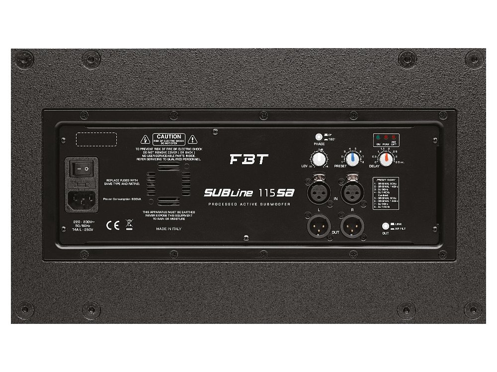 SUBline 115SAProcessed Active Subwoofer 700W RMS – 132/135dB SPLThe SubLine 115SA is a compact ACTIVE sub weighing just 28Kg .Yet delivers amazing punch. The built in amplifier is 700Watts at 8 Ohms it will deliver 135dB SPL from the 15″, 3″ Voice coil driver.incredible input flexibility with 2.1 option and powercon true 1 in and out . This great combination is in a Baltic birch plywood cabinet completely made in Italy . PRODUCT DESCRIPTIONThe SUBline 115SA has been completely redesigned with a bass-reflex configuration, built in birch plywood and aimed to extend the low frequency response to a wide range of FBT speaker systems.Created with the aim to maximize SPL/SIZE ratio, they have Class D amplifiers, switch mode power supply and Digital Signal Processor with presets to match any other FBT speaker.With IN/OUT stereo connectors, it is possible to use only one subwoofer with Left and Right speakers. The Neutrik TRUE1 Power connection negates the need for a power switch while offering a solid locking connection.Optional wheels,, ergonomic integrated carrying handles and tour-grade plywood cabinets allow an easy transport
