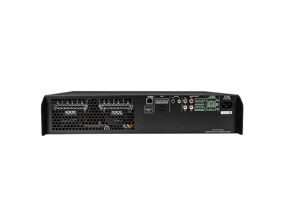 Compact four-channel 4 ohm installation amplifier (up to 500W per channel) or 1000W on each of the two 100V line output. Digital signal input and output for easy interconnection without conversions. Dedicated DSP with full connectivity and control via stand-alone Wi-Fi. Ethernet and GPIO
