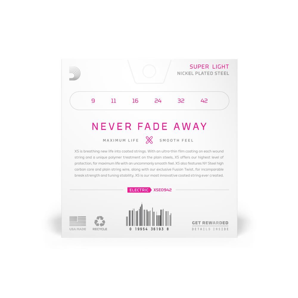 XS is breathing new life into coated strings. With its ultra-thin film coating on every wound string and unique polymer treatment on the plain steels, XS offers our highest level of protection for maximum life with an uncommonly smooth feel. XS also features NY Steel high carbon core and plain string wire, along with our exclusive Fusion Twist, for incomparable break strength and tuning stability. XS is the most innovative coated string ever created.