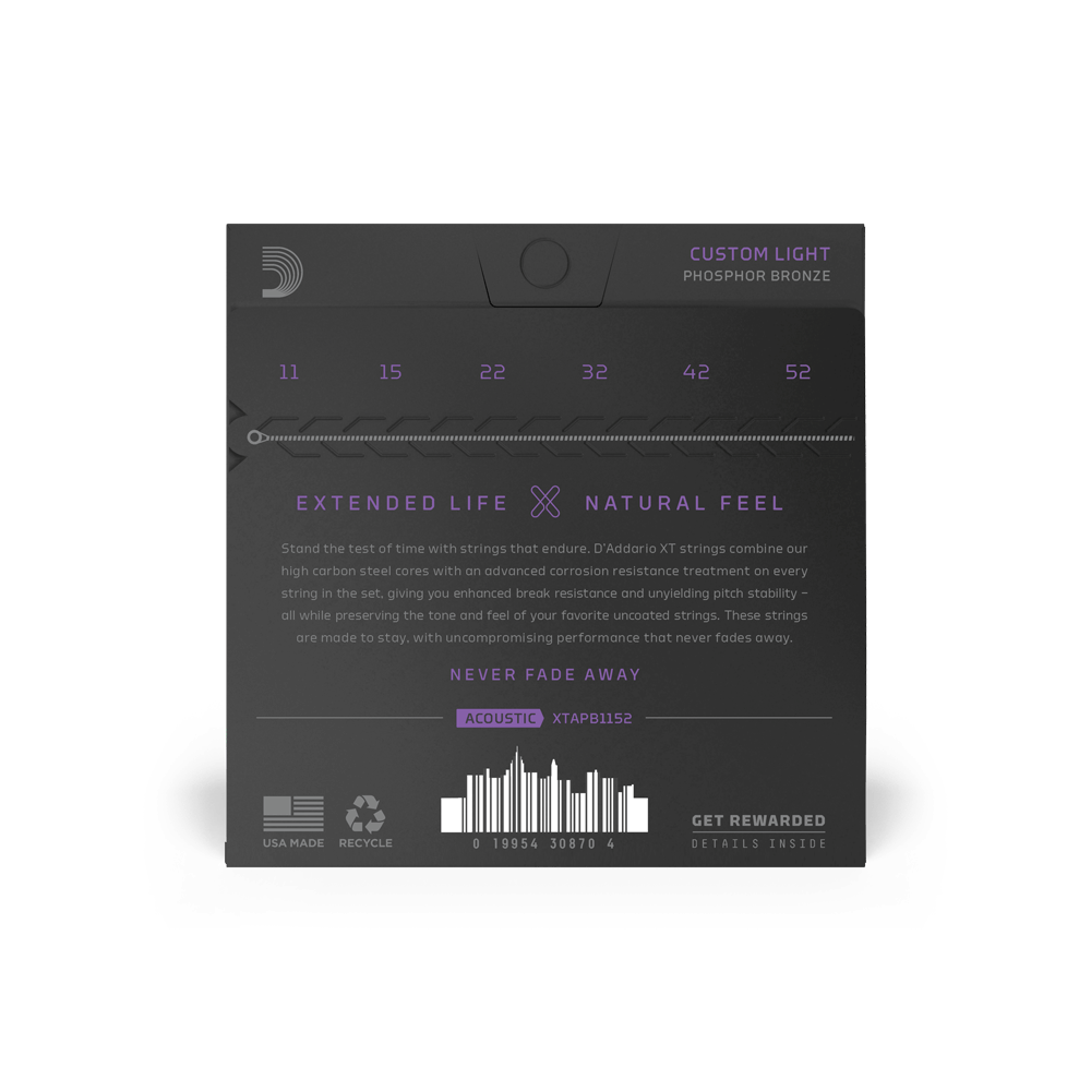 Since D’Addario introduced Phosphor Bronze acoustic guitar strings in 1974, they’ve been synonymous with warm, well-balanced tone. XT Phosphor Bronze offers that and more, boasting enhanced break resistance, better pitch stability, and longer life than our standard phosphor bronze strings. The XT coating delivers advanced corrosion resistance, while still retaining the warm tone and natural feel of the uncoated string. Beneath the coating, these XT acoustic strings are constructed with a NY Steel core, phosphor bronze wrap wire, and Fusion Twist technology, affording tonal versatility with added resilience, excellent for a wide range of acoustic styles. This 11-52 Custom Light gauge set has slightly more volume and projection than Extra Light, while still being easy to play.